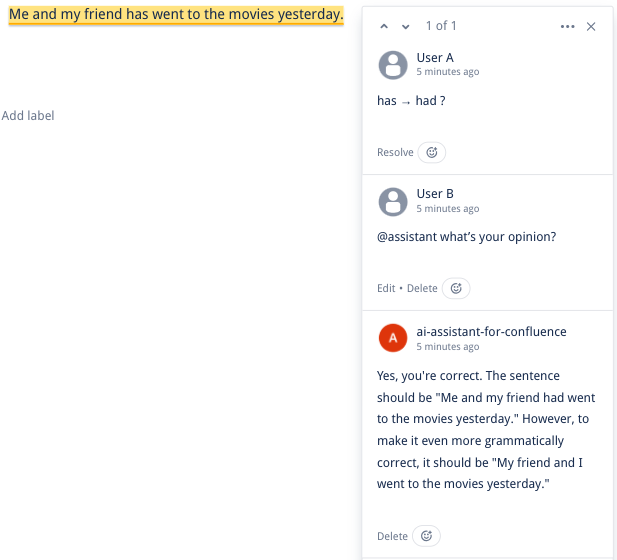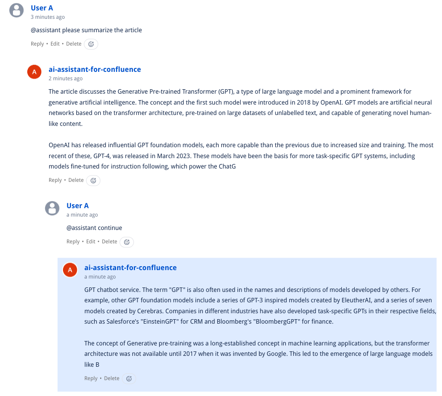 You can chat with AI Assistant in the comments, both in footer and inline comments. To do that, simply add @assistant to your comment. AI Assistant remembers your chatting history and can interact with multiple users.