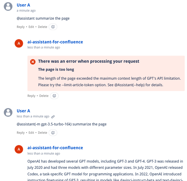 Please note that the request timeout limit (Handling Context Length Exceed Error in AI Assistant ) also exists when handling comments. To solve this, you can use @assistant continue to continue generating the rest of the response by the AI assistant..