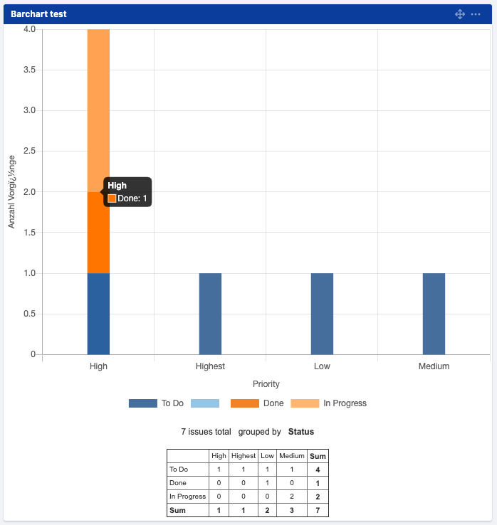Open a dashboard with a bar chart gadget. Hover over a bar to see the issue count for the hovered element.