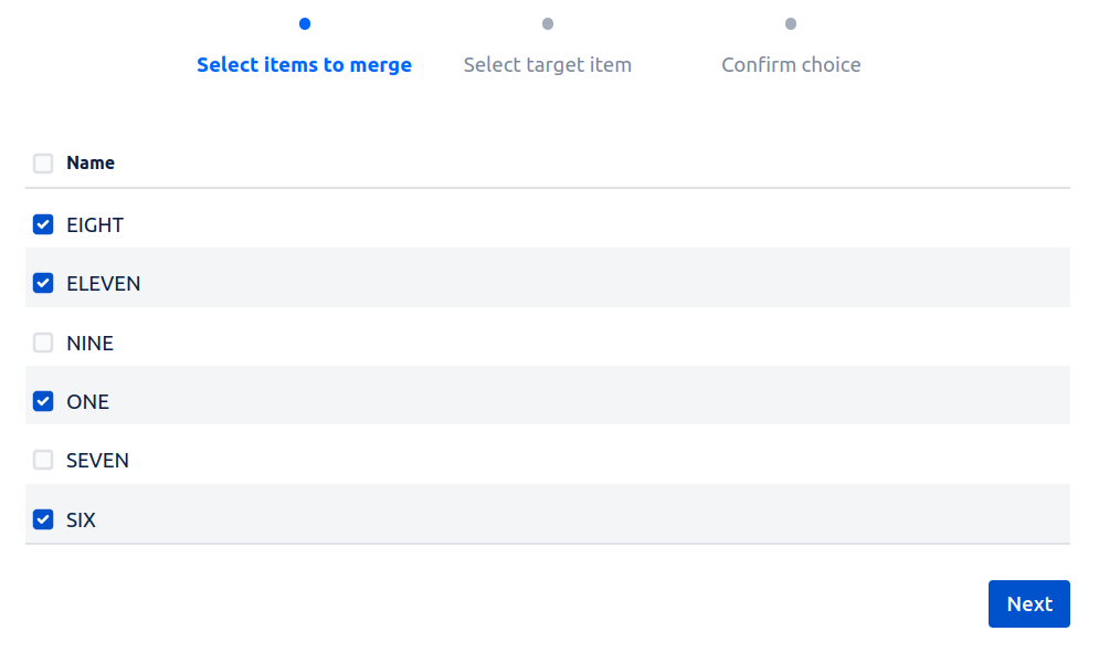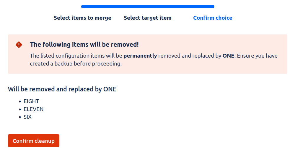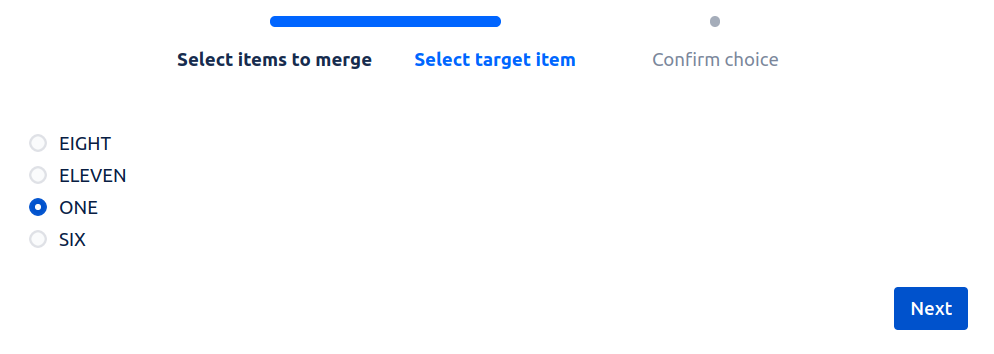 Next, select the item you want to merge into - the target item. This will be the configuration item that will replace the selected items. Please note that if you selected a Jira default item as part of your merge selection, it will have to be the merge target, as it cannot be deleted.
