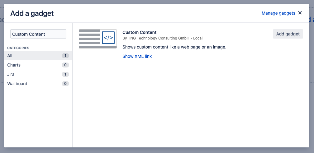 Create a new dashboard or edit an existing dashboard to add a new Gadget. Click on “Add gadget” and search for “Custom Content” to add it to the dashboard.