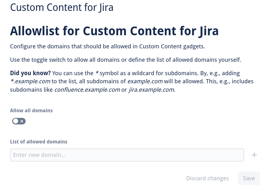 2. The Allow all domains toggle enables allowing any domains. If it is turned off, only the domains in the list below are allowed.