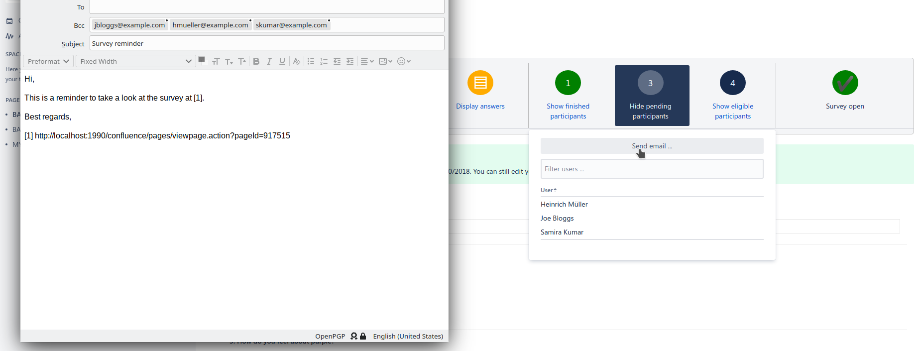 Click on the “show” button in the survey results panel to get a list of all respective participants. Then, click on “Send email …”. This will open a new email window in your default email application with all users of this group as Bcc recipients.
