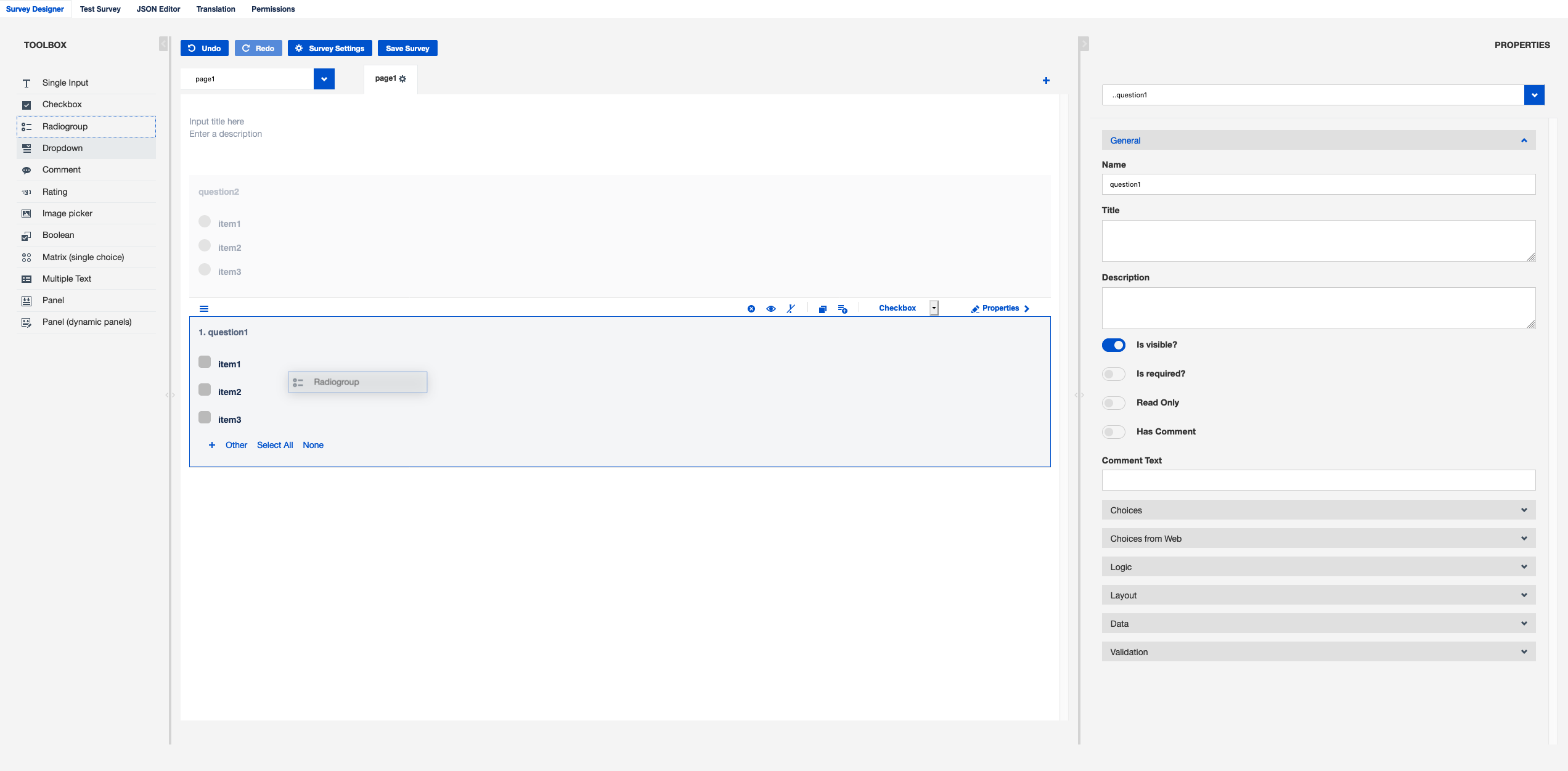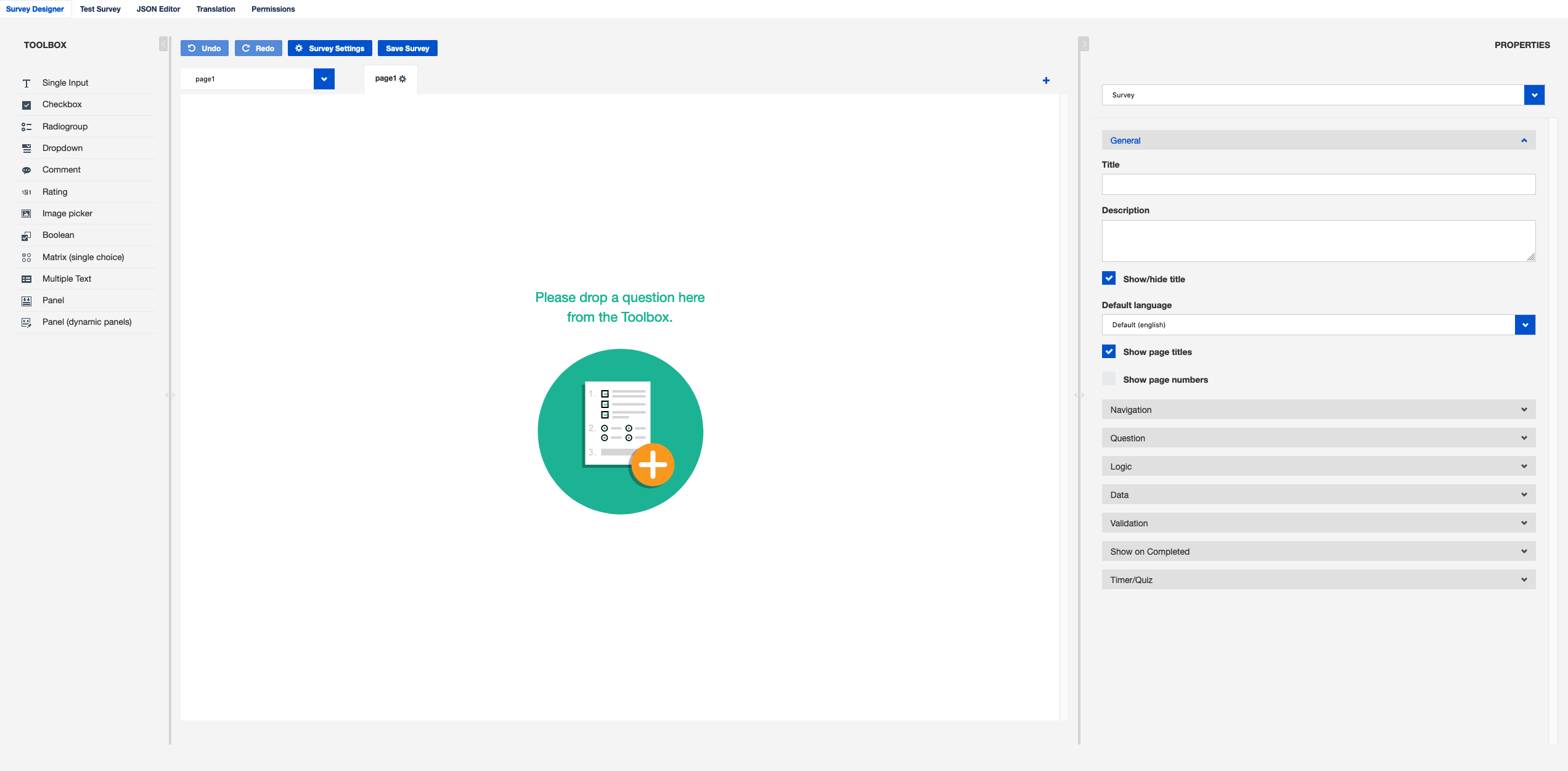 You can now edit your survey by dragging questions from the toolbox into survey. You can also edit questions in-place, e.g. the header or the response options, add more pages by using the "+” icon or adjust the general settings of the survey.