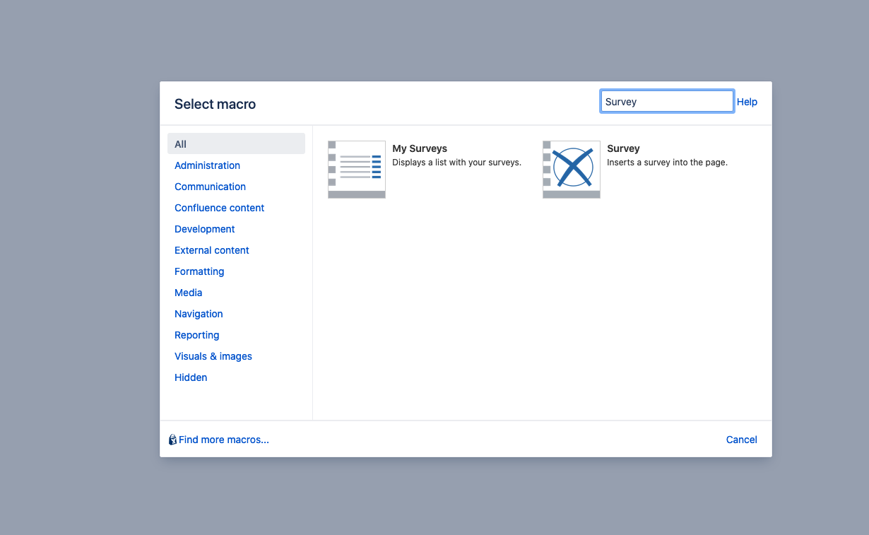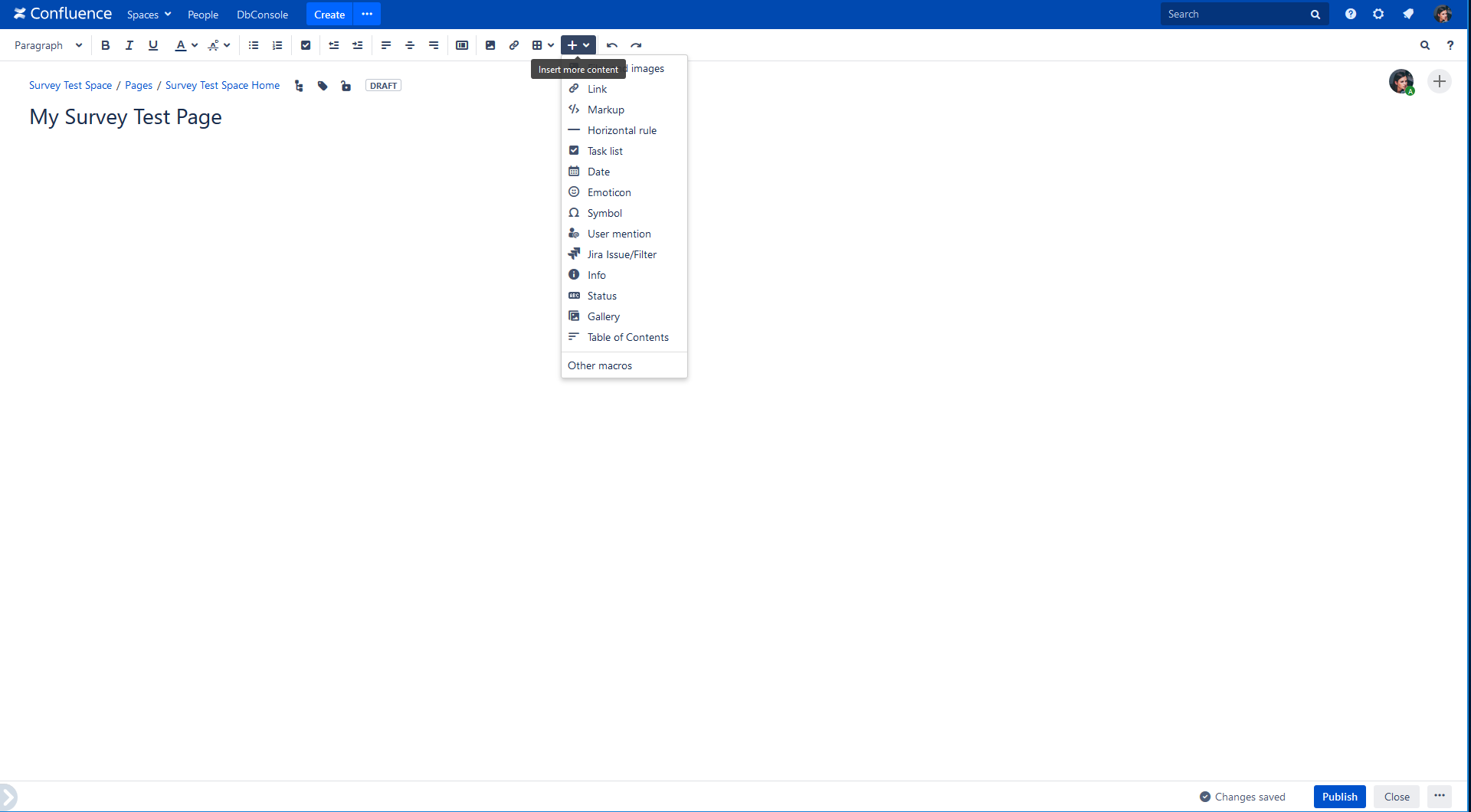 Enter the Edit-mode on the page where you want to create the survey. Click on the "Insert more content" menu (using the "+" icon in the toolbar) and select "Other macros" from the drop-down menu.