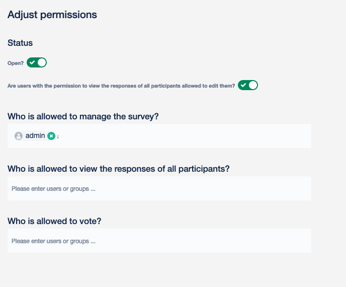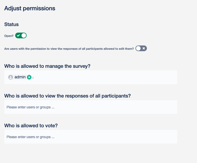 Permissions to vote, view the result and administer the survey can be managed in the "Permissions” tab. Learn more about survey permissons.