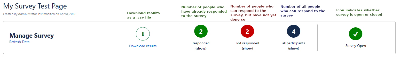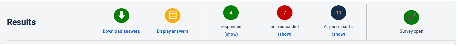 You can view the responses by clicking the “Display answers” area in the header. You need the view results permission to see this panel. At least one participant has to have responded to the survey.