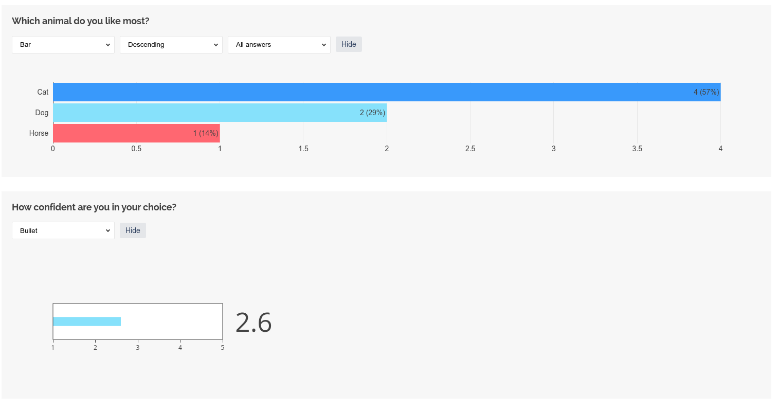 You get graphs for every question. You can choose between different plots, i.e., bar charts, pie charts, gauge charts depending on the question type.