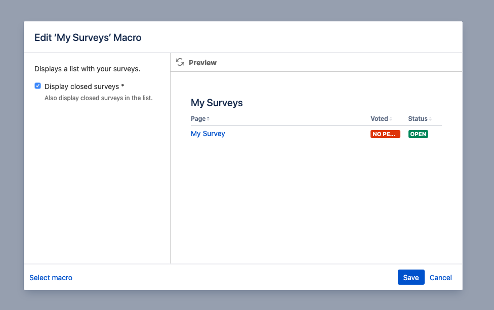 For each user, it lists the surveys were that particular user has a permission (vote, view results or manage). In the configurations of the macro it can be toggled whether closed surveys should be shown.