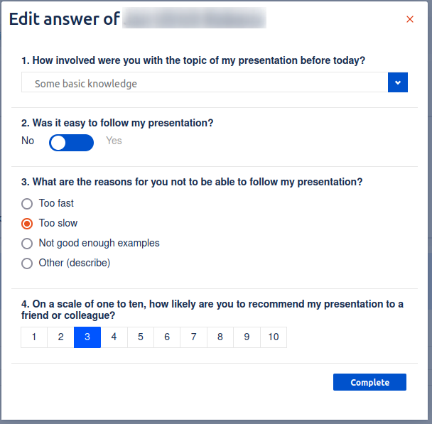 Sometimes participants may request that a survey manager respond on their behalf.This may occur if they want to make minor modifications to their response while out of the office or after the survey is closed. Survey managers can respond for participants to overcome this kind of situations.