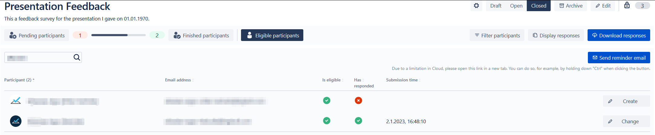Click on “Create“ or “Change“ dependent of whether the participant has already responded.