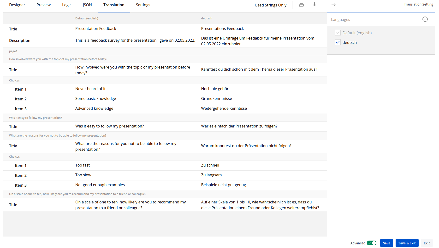 In the “Preview“ tab you have a quick look on if your translation is alright. For this change the language in the top right corner and try the survey in that language yourself.