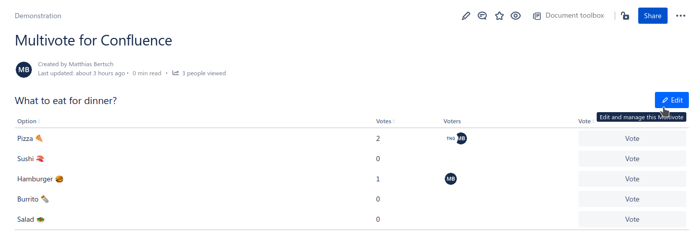 Click the “Edit” button in the top-right corner of the Multivote macro.