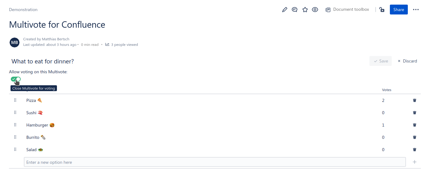 At the top you can see a toggle which allows to toggle whether voting on this Multivote is currently allowed. Switch this toggle to close the Multivote.