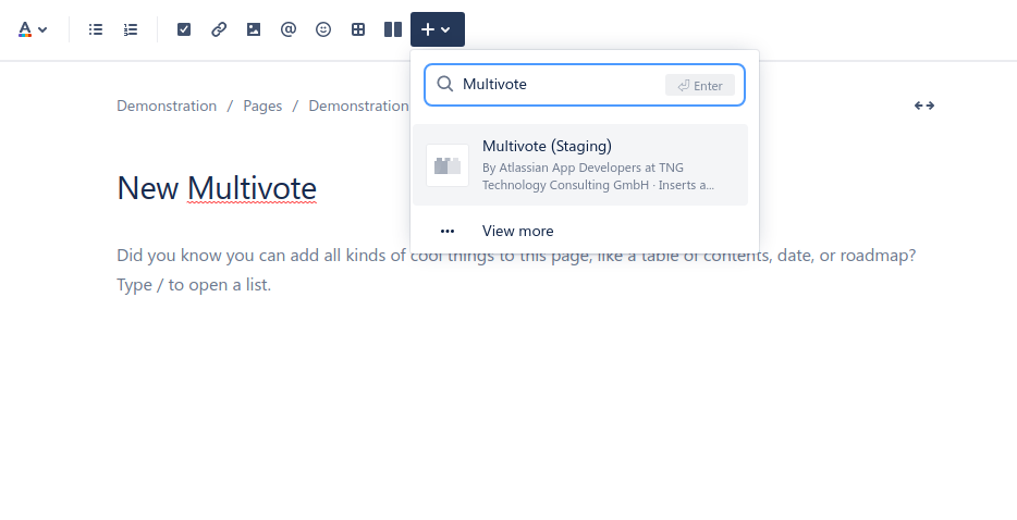 Search for “Multivote” and select the Multivote macro to add it to the page.