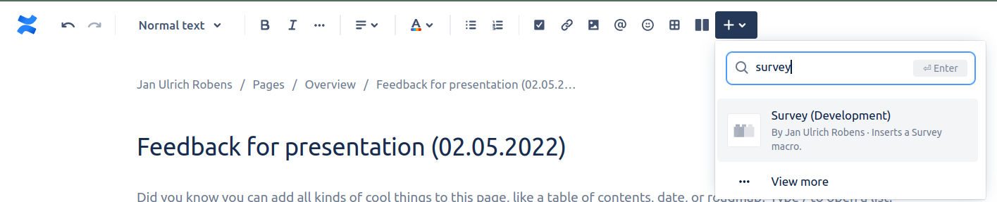 Open a page and add a survey macro either by typing “/survey“ or by adding it via the “+“ sign at the top of the page and searching for survey.