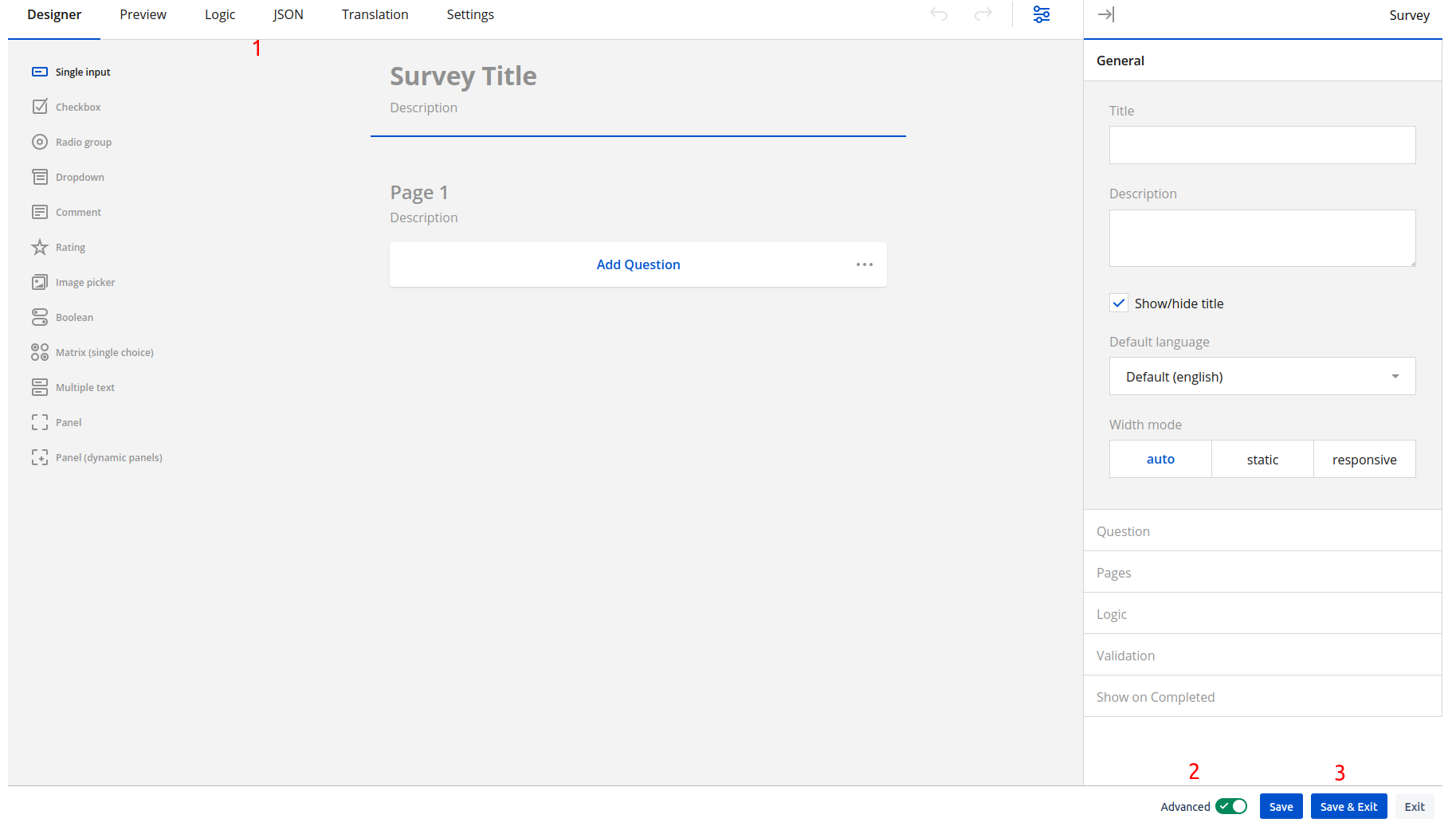 Advanced designer mode more provide the user detailed control over some properties of the survey.