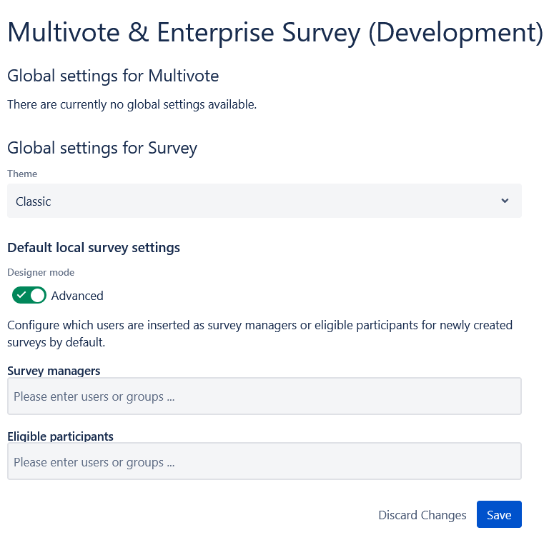 You will then see a global settings page, which enables setting some defaults for all surveys located in this Confluence instance.