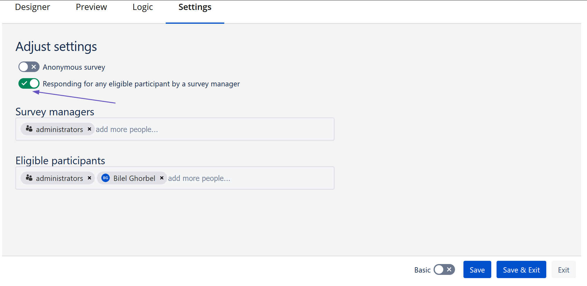 First of all the survey needs to allow the survey manager to respond for other users. Make sure that “Responding for any eligible participant by a survey manager“ is turned on and the survey is not anonymous.