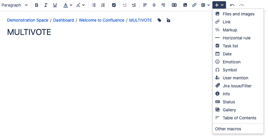 Click on the “+” icon in the toolbar and select “Other macros”. Type “multivote” into the search field and select the Multivote macro to add it to the page.