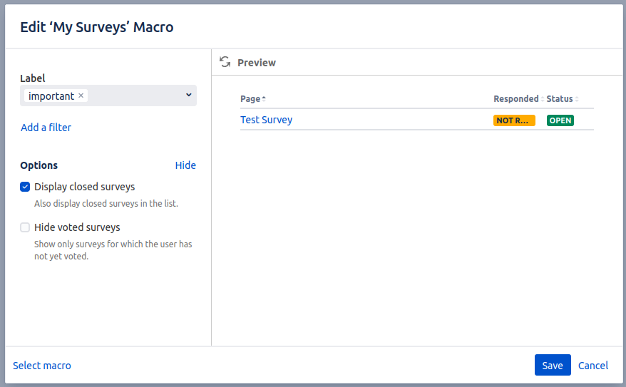 Click “Save” to add the My Surveys macro to the page and update the page.