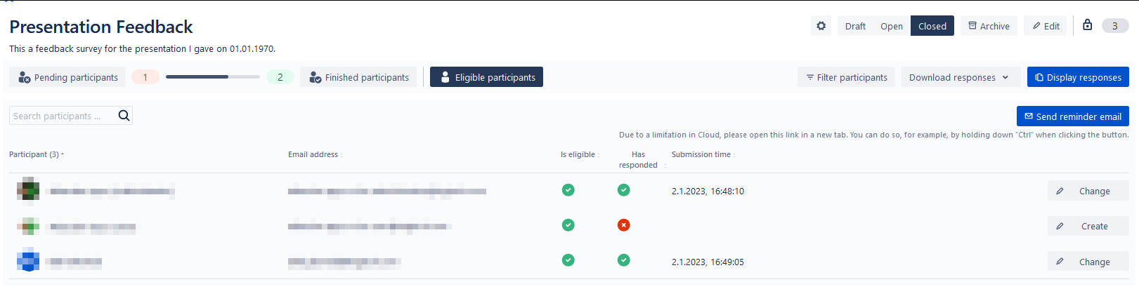 Email address: The email address of the person who responded to the Survey. This field may be empty in Cloud instances if the participant chooses not to disclose this information in their Confluence privacy settings.