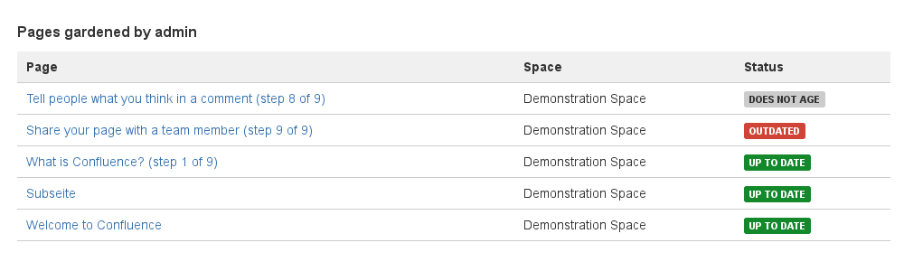 The page gardener is automatically notified when their pages are getting out of date and the exact pages growing out of date are shown to them. By utilizing a Confluence macro on an arbitrary page, they can obtain a summary of the current status of all their pages.