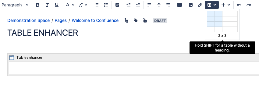 Insert the Table Enhancer macro into a page and add a table to the body of the Table Enhancer macro to create a new Table.