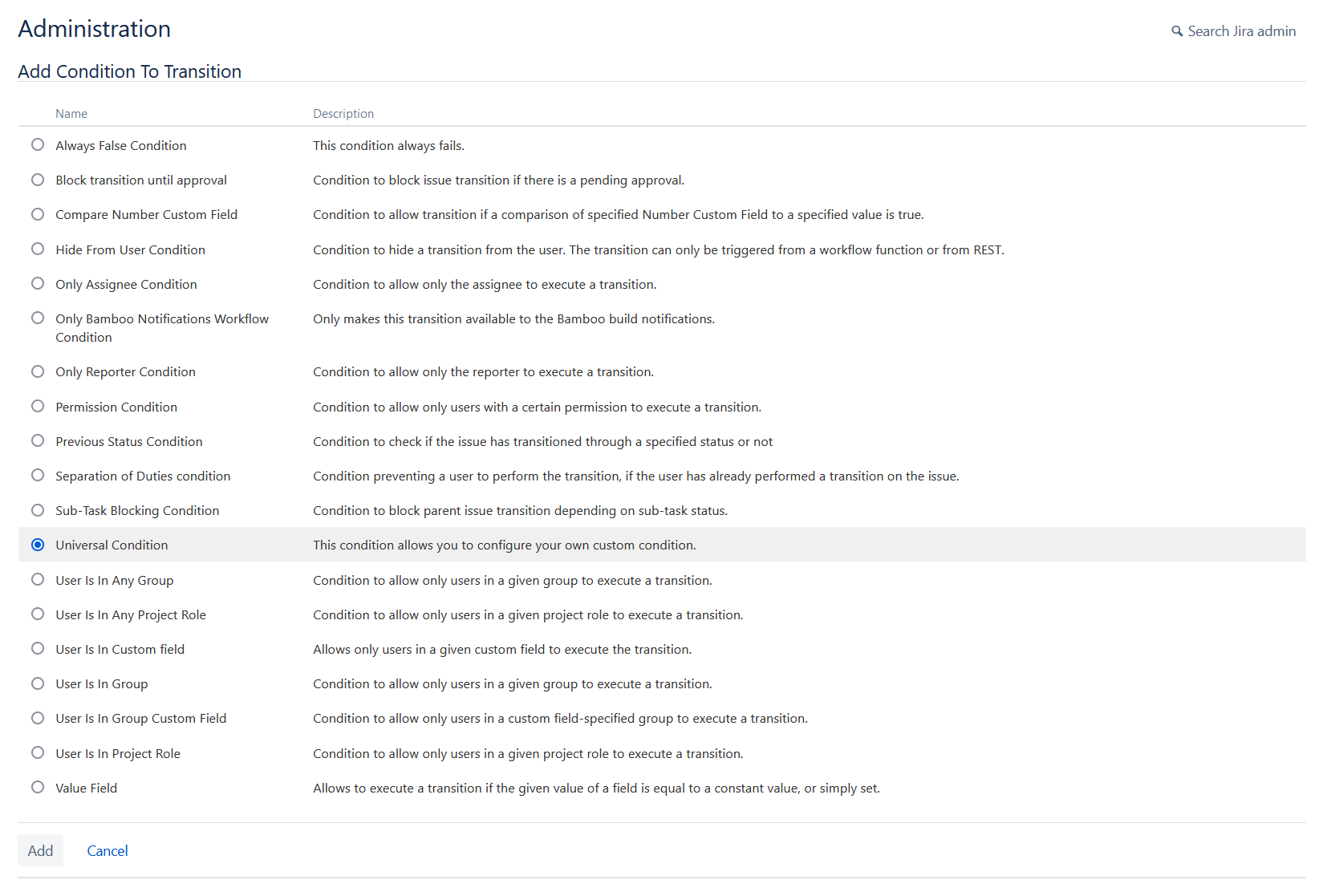 4. In the list of conditions, select “Universal Condition” and click on “Add”.