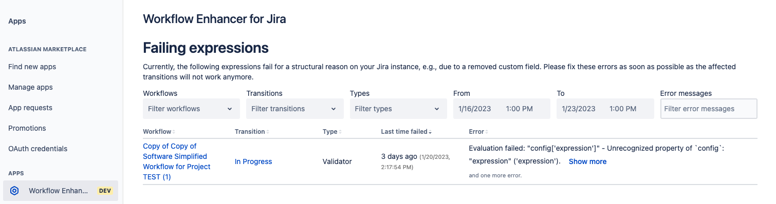 You will see a list of all unresolved errors in your instance. All errors indicate to which workflow and transition they belong. Also, the time of the last failure as well as the error itself are shown. You can navigate to the respective element where you are able to resolve the error(s). Please note that as soon as you have marked an error as resolved, it will no longer show up the global list of errors.